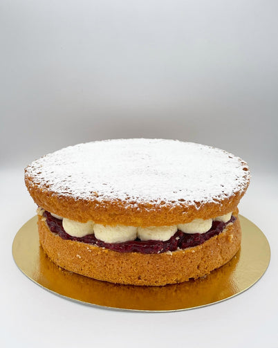 An all-time English classic - vanilla sponge sandwiched with vanilla butter cream, homemade berry jam and finished off with fresh berries.