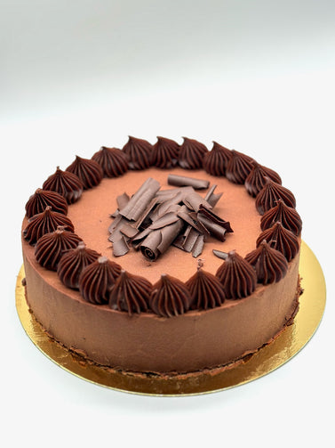 Dark, moist, chocolate sponge layered with fluffy chocolate mousses and finished off with dark chocolate ganache and chocolate shavings.
