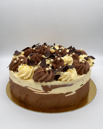 A white & dark chocolate cake made with moist dark chocolate sponge, and alternate layers of dark & white chocolate mousse. Finished with swirls of both chocolate. Beautiful dinner party dessert or a cake for a special occasion.