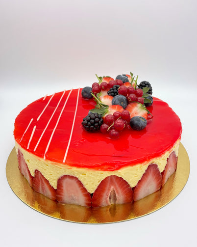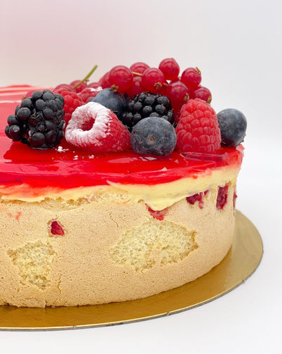 A traditional French style sponge cake made with vanilla sponge, mousseline cream and finished with fresh fruit. Light and fresh tasting this can be made with Raspberries or Strawberries.