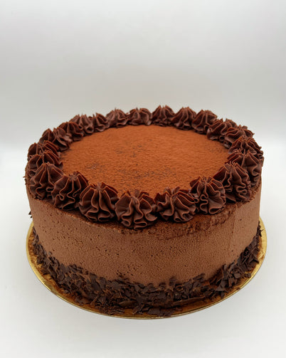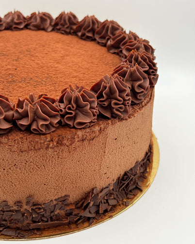 This is a delicious, light & airy flourless cake, sandwiched with decadent chocolate mousse and a fine layer of our raspberry jam, which provides a lovely contrast to the chocolate. The final finish on the cake is dark chocolate ganache. The cake is also nut free.