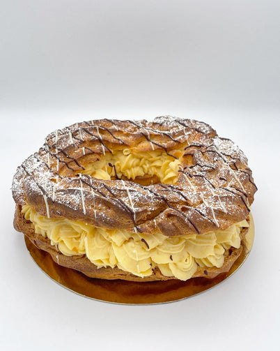 The large version of our delicious Paris-brest, filled with hazelnut crunch cream and topped off with flaked almonds. Beautifully golden choux pastry freshly baked and filled on the day of the order.